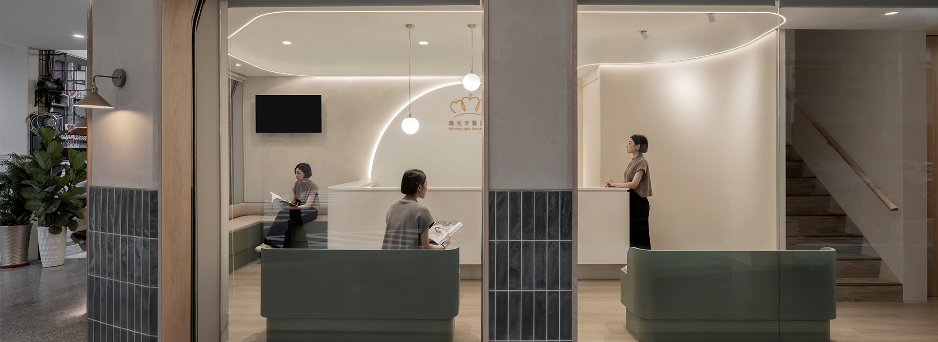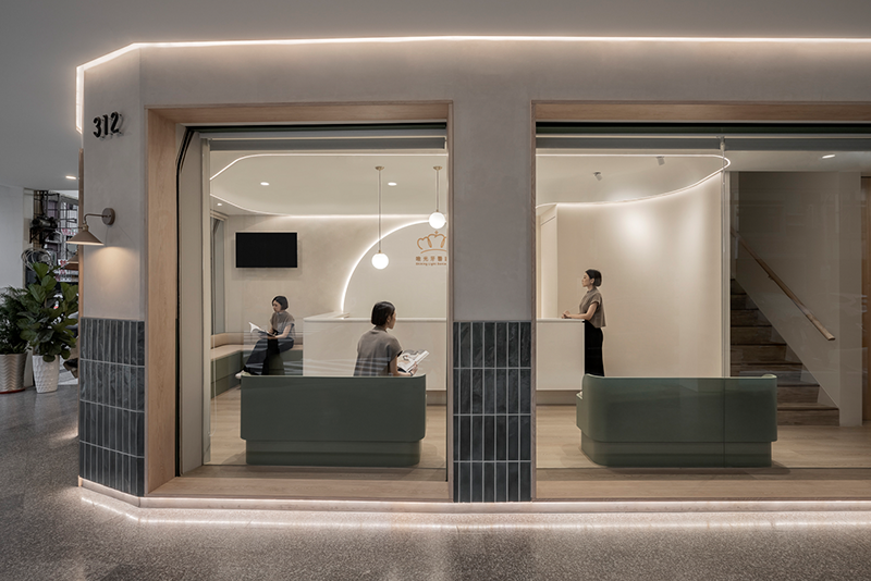 以唯光牙醫診所設計為例,原建物為老屋,成立設計整合大小不一的外牆開口,打造具穿透感的大面玻璃櫥窗,結合有機燈光放大空間印象,如街角生活的一部分,展現貼近社區的親切感。