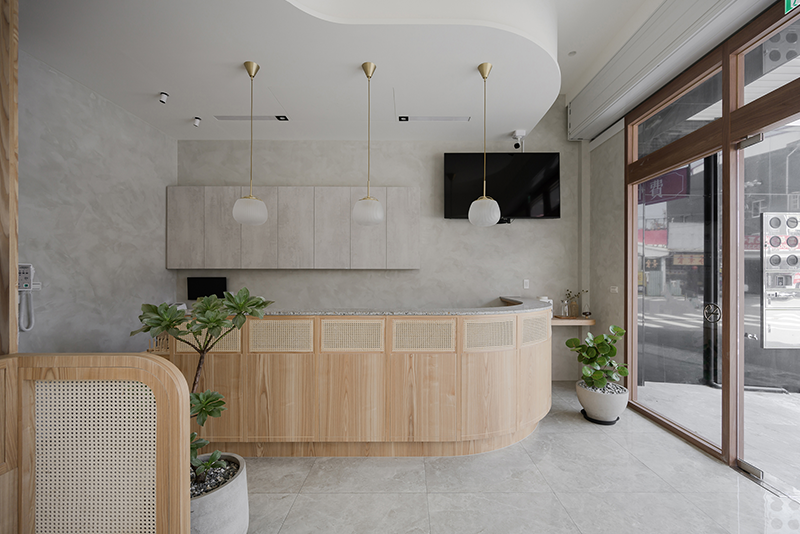 櫃台設計既要兼顧美感,也需考量實用與互動需求。一如安成中醫診所設計,我們刻意讓櫃檯以灰白呈現,跳脫木質調地坪和腰牆,在最少材質下,傳遞從簡、樸實形象,再低調搭配的黃銅標誌,使整體更具識別性。